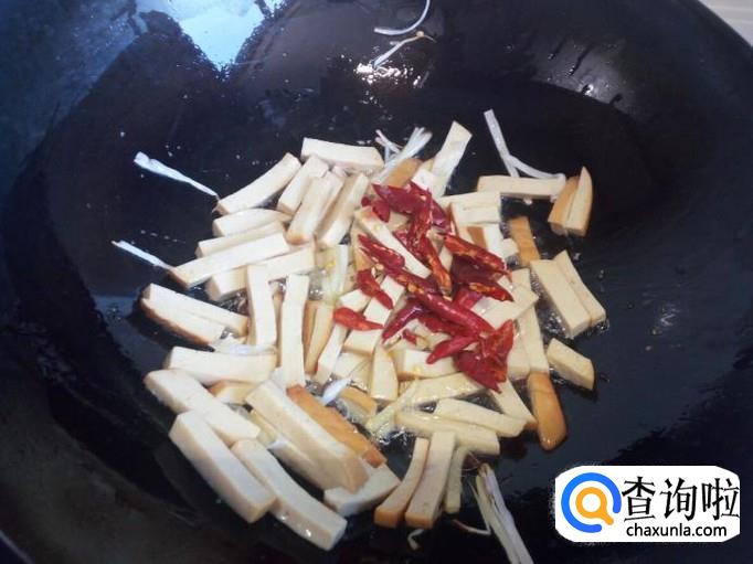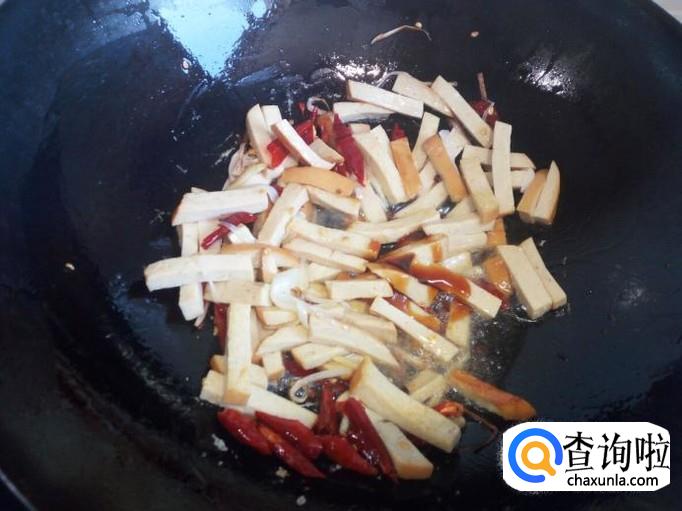 炒至素鸡变软,放入红干椒,料酒,少许蚝油翻炒。放入少许水,这样炒的素鸡比较软乎。