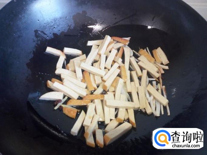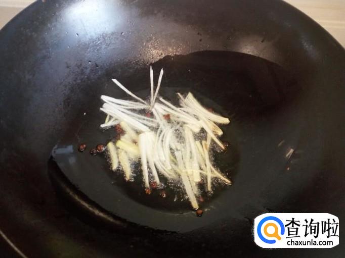 锅内放入油加热,油热后放入花椒,葱,姜,爆锅。放入素鸡翻炒。
