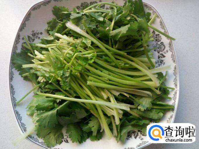 香菜收拾清洗干净,控干水分,切成段。