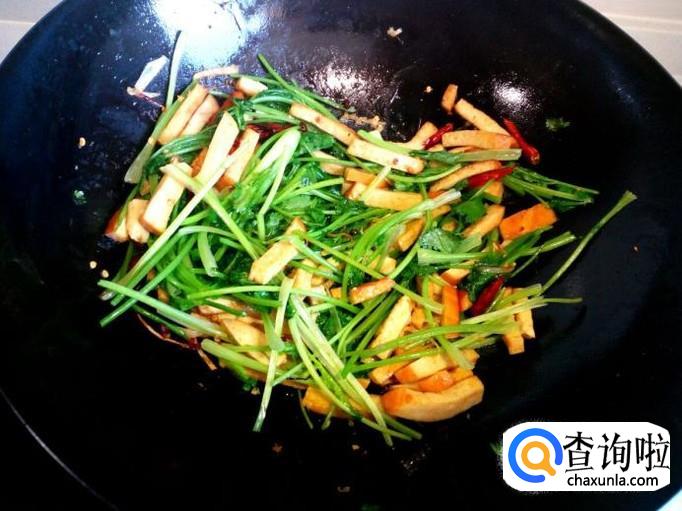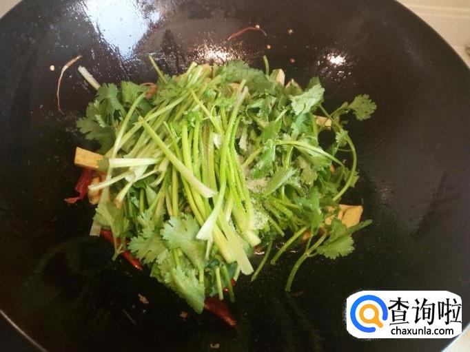 随即放入香菜,大火快速翻炒,放入少许盐(慎重放盐,素鸡含盐成分)。香菜略翻炒至出亮光,立即关火,放入少许味精,出勺。