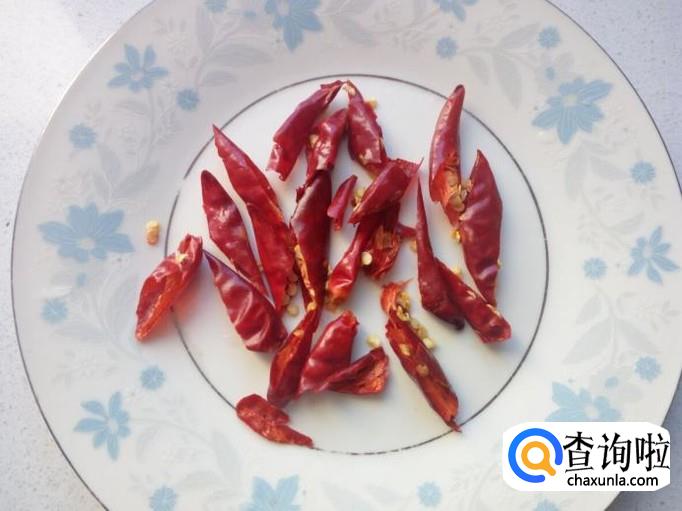 红干椒用水清洗干净,控干水分,斜刀切成段。