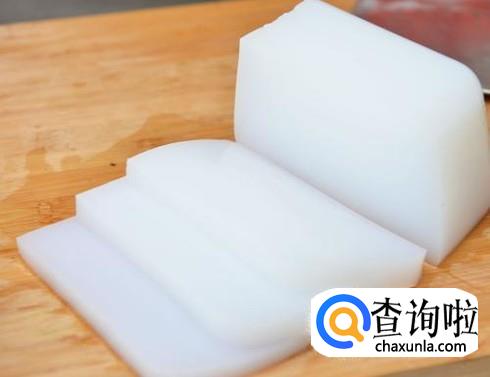 将凉粉洗净后,切成大小相同的长条,放置于盘中。