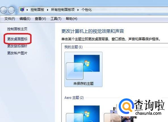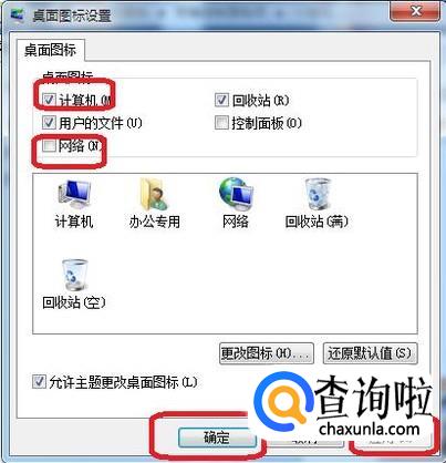 如图所示,点击“更改桌面图标”,然后选中“计算机”和“网络”,点击应用和确定就可以了,桌面上就会显示相应图标。