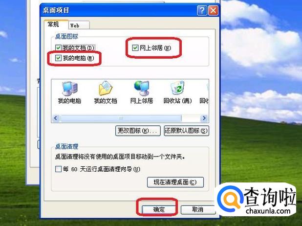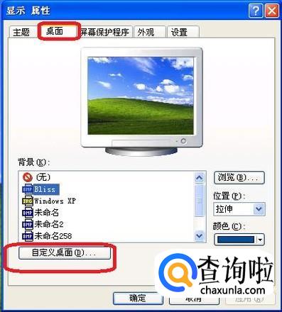 出现“显示属性”面板,我们点击“桌面”标签,然后点击其中的“自定义桌面”,然后把“网上邻居”和“我的电脑”选中,点击确定就可以在桌面上显示了。
