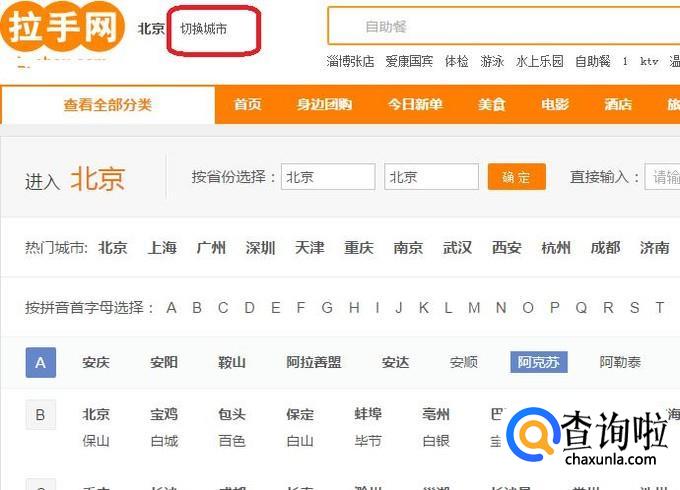 进入拉手网以后,我们先要选择所在城市,如图所示。
