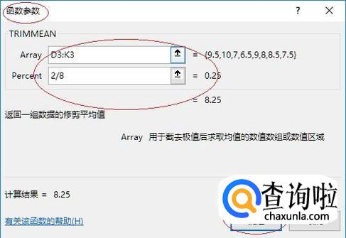 弹出"函数参数"对话框,如图所示。函数参数文本框输入函数参数,完整公式为"=TRIMMEAN(D3:K3,2/8)"。