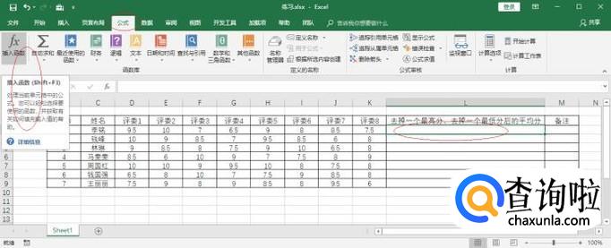 如图所示,选中"去掉一个最高分、去掉一个最低分后的平均分"单元格数据区域。选择"公式→函数库"功能区,点击"插入函数"图标。