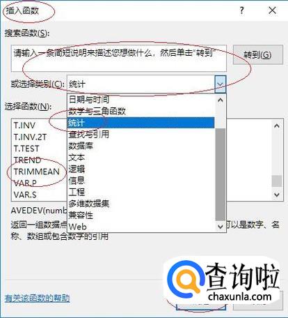 如图所示,弹出下拉列表选项。选择"统计→选择函数→TRIMMEAN"函数,设置完成点击"确定"按钮。