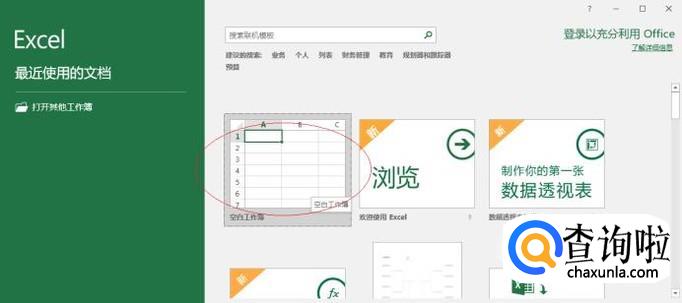启动Excel 2016电子表格应用程序,如图所示点击界面右侧新建空白工作簿。