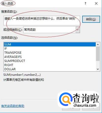 弹出"插入函数"对话框,如图搜索。点击"搜索函数或选择类别"文本框右侧向下箭头,下步将进行利用公式转换经纬度的操作。