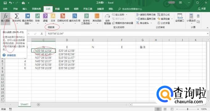 如图所示,选中"经纬度"单元格数据区域。选择"公式→函数库"功能区,点击"插入函数"图标。