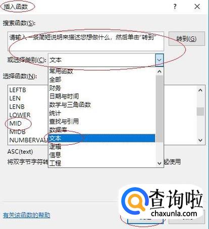 如图所示,弹出下拉列表选项框。选择"文本→MID"函数,设置完成点击"确定"按钮。