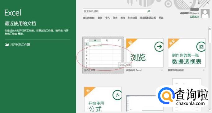 启动Excel 2016电子表格应用程序,如图所示点击界面右侧新建空白工作簿。