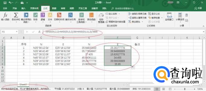如图所示,拖动选定区域进行序列填充。完成利用公式转换经纬度的操作,本例到此希望对大家能有所帮助。