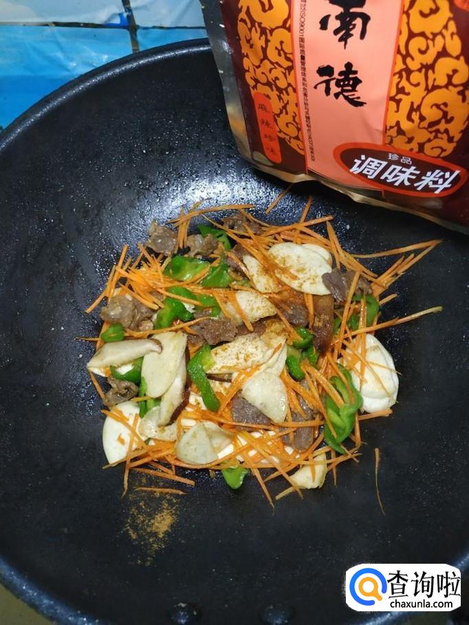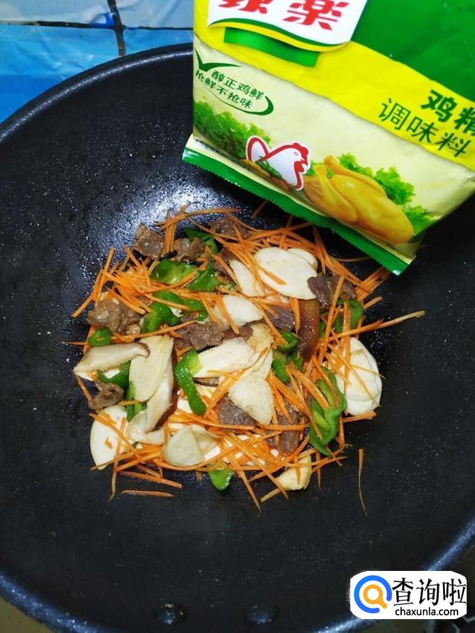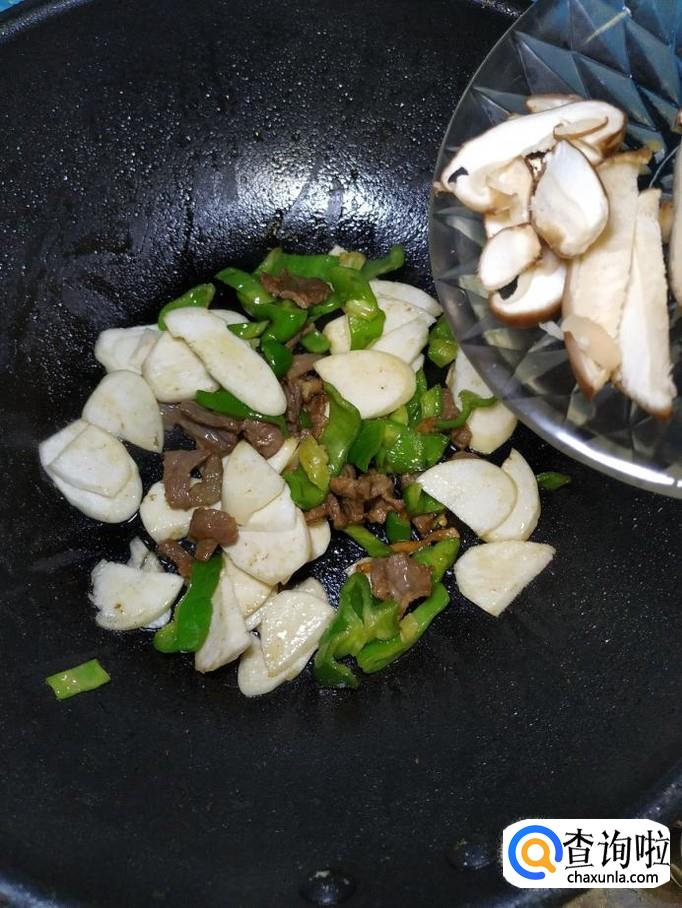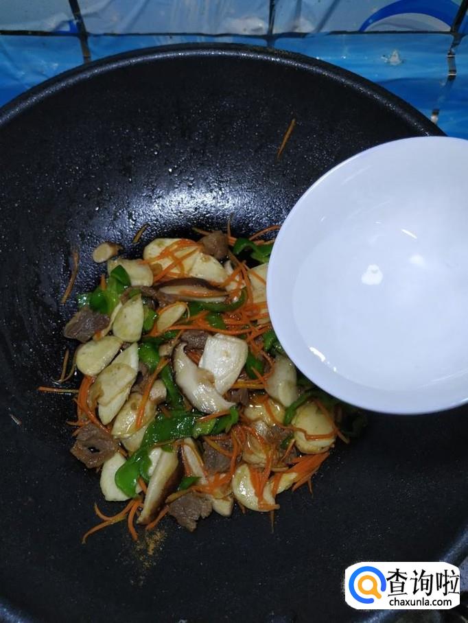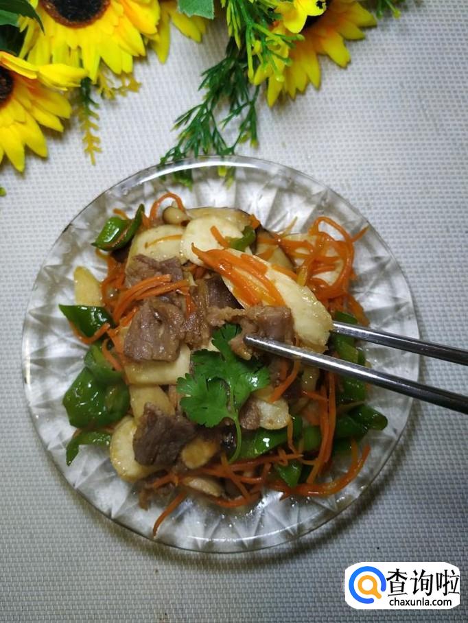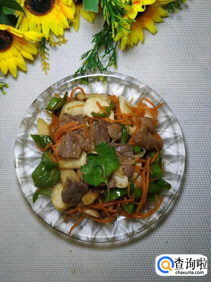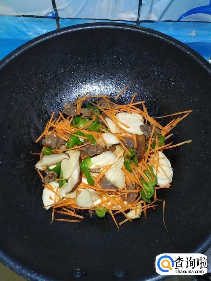 茭白适量牛肉适量,青椒适量,香菇适量,生姜适量,盐适量,鸡精适量,五香粉适量,生抽适量,料酒适量,陈醋适量,胡萝卜适量。