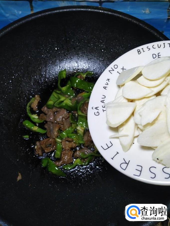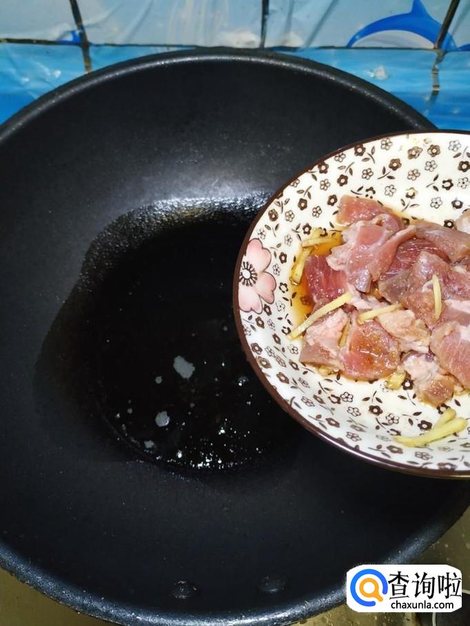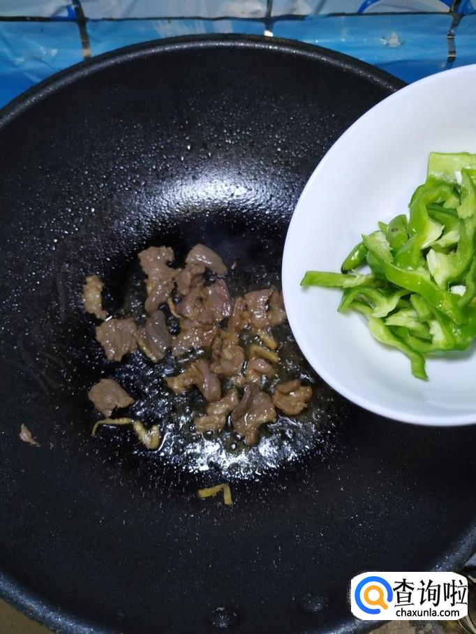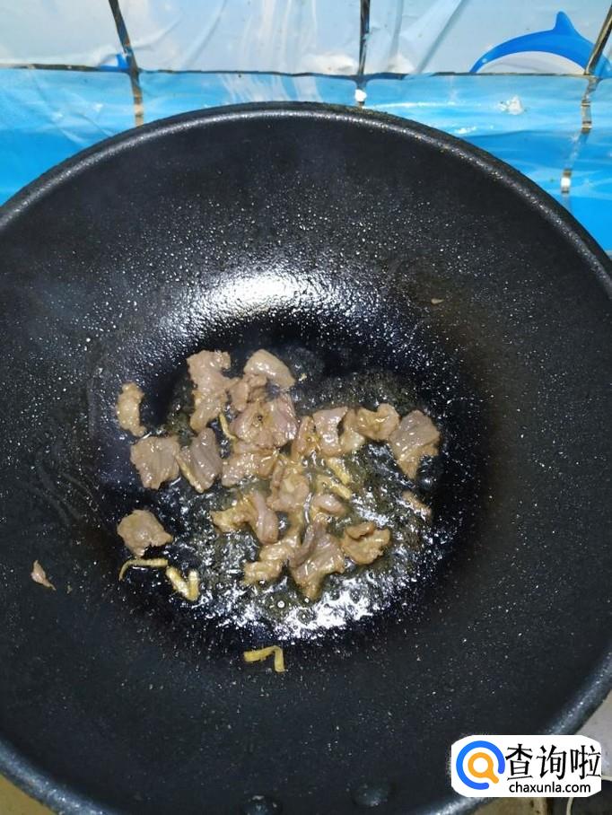 炒锅中放入适量油,油热后将牛肉块放入锅中炒熟,切成薄片的牛肉是比较容易熟的。