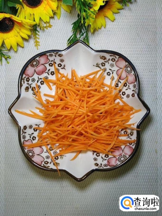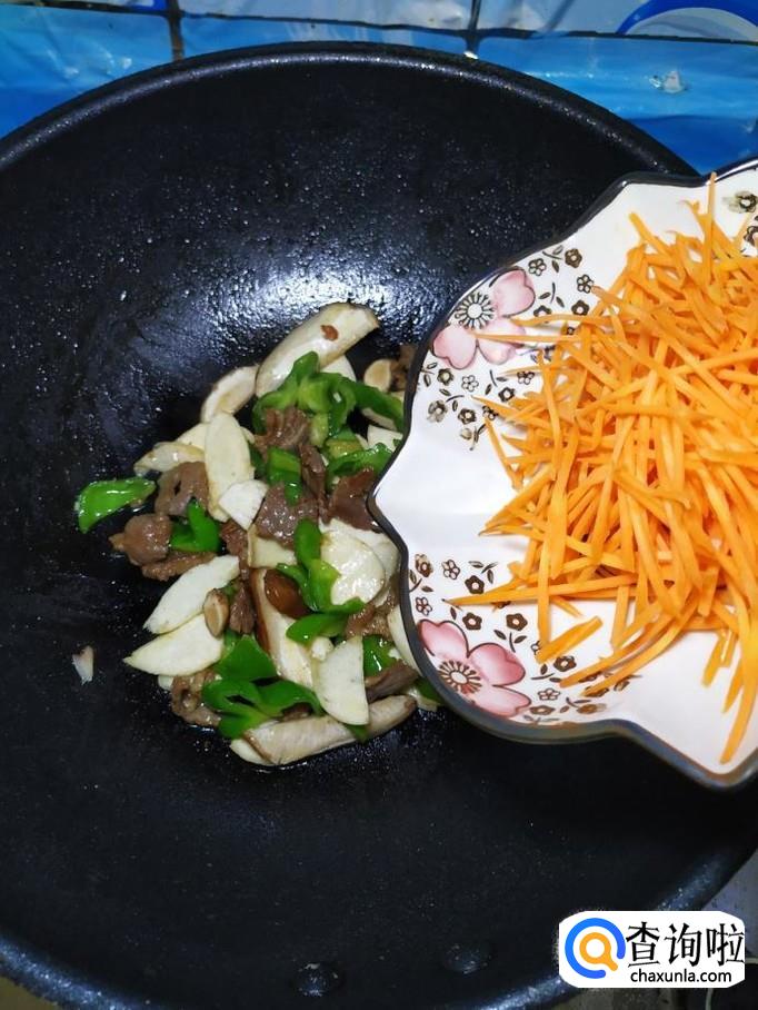 将香菇片和之前擦好的胡萝卜丝也倒入锅中,翻炒均匀。