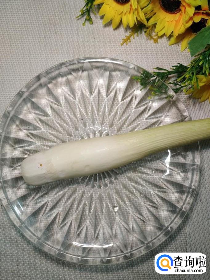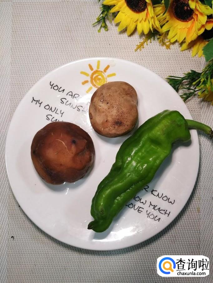 准备一根茭白,洗净后去除外皮;准备适量的新鲜的香菇和青椒;再准备少许胡萝卜,擦成丝,放入盘中备用。