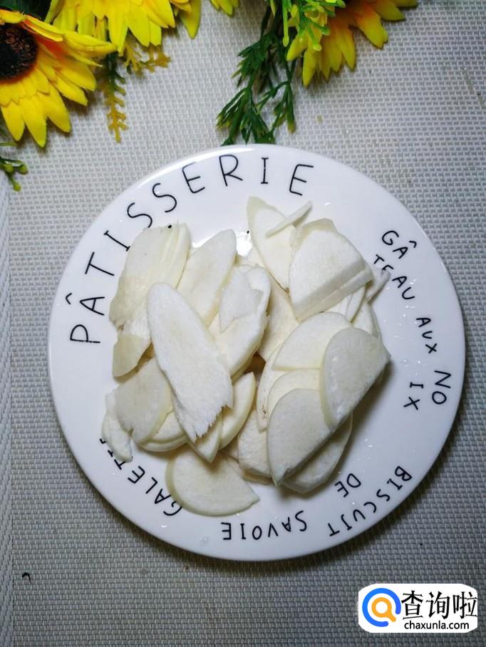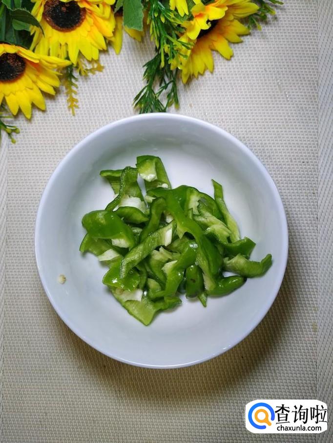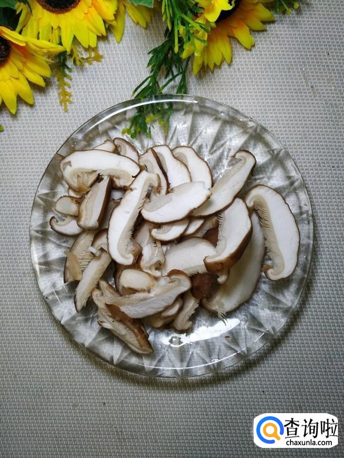 将茭白切成薄片儿,香菇切成片,青椒切成丝,分别放入盘中备用。