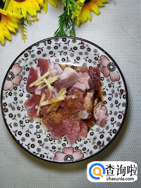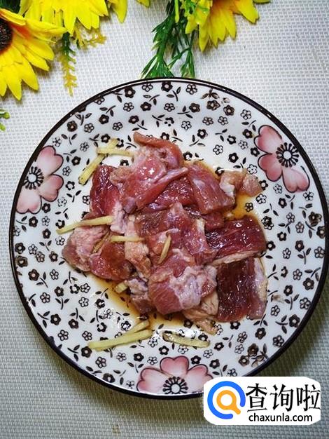 准备适量牛肉,用清水洗净后,切成片儿,再准备适量生姜,洗净后切成丝,放在上面,加入适量盐,鸡精,五香粉,生抽,料酒,搅拌均匀,腌制15分钟左右。