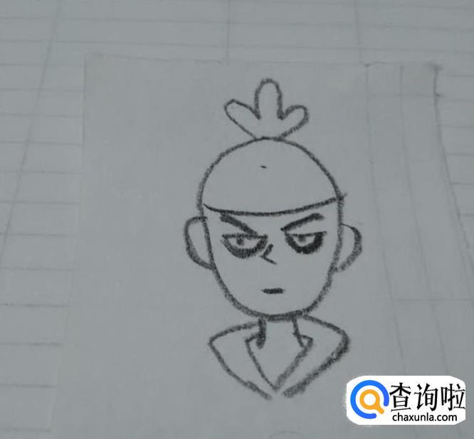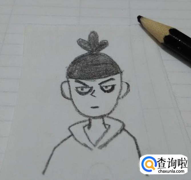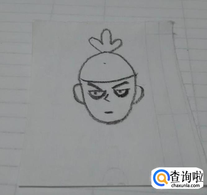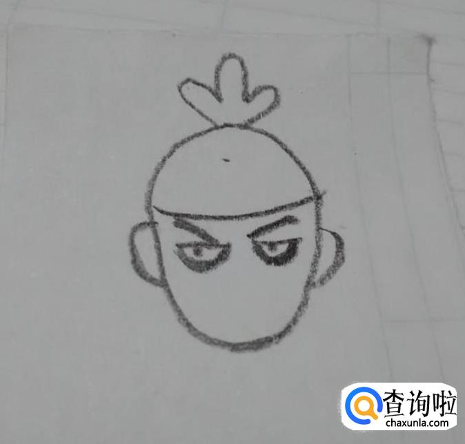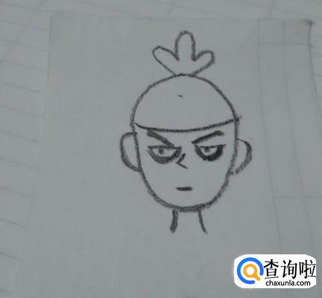 在头发下面,画两条粗粗的斜线,表示他的眉毛。