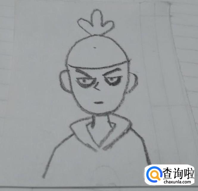 在头的上方画一条弧线,再画一个双线的箭头,表示他的头发。