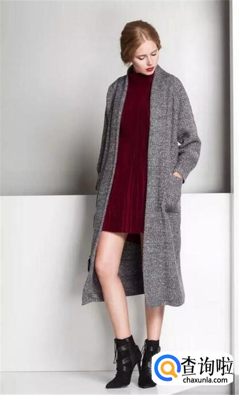 过膝盖的长宽灰色毛衣,搭配一条酒红色的连体裙,然后再穿上一双特色的高跟鞋,也是很有韵味的哦,外套的线条足够长,可以拉长人的视线,给人的感觉变高了很多。