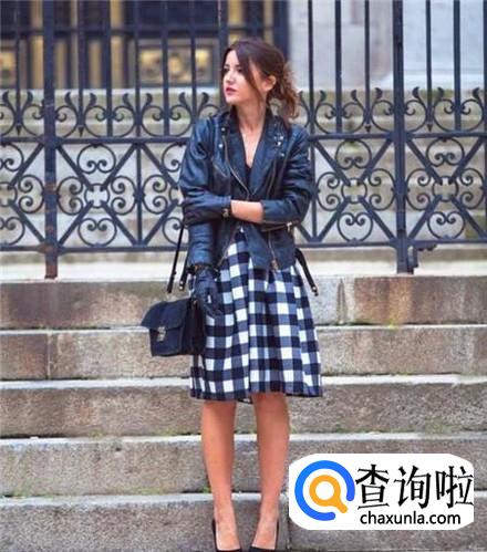 这是我个人很喜欢的一种搭配方法,一件机车皮夹克搭配一条略带蓬松的黑白格裙子,整个人又酷又帅且还有满满的女人味。