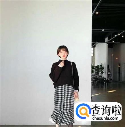 这样一条黑白格的半身裙搭配一件黑色的高领毛衫,优雅中带着一点点小俏皮,还有邻家小妹子的可爱气息。