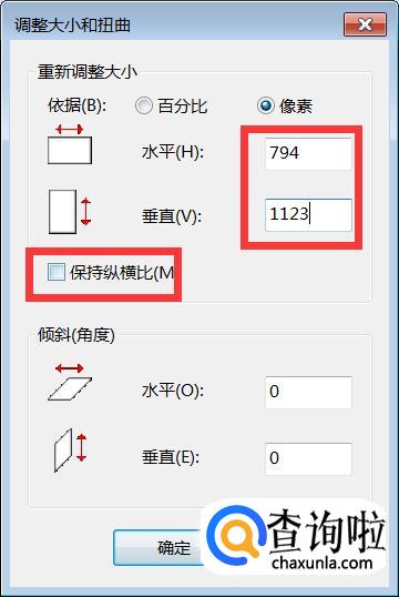 我们把“保持纵横比”前面的方框的勾选去掉,把像素调整一下,设置成794x1123。