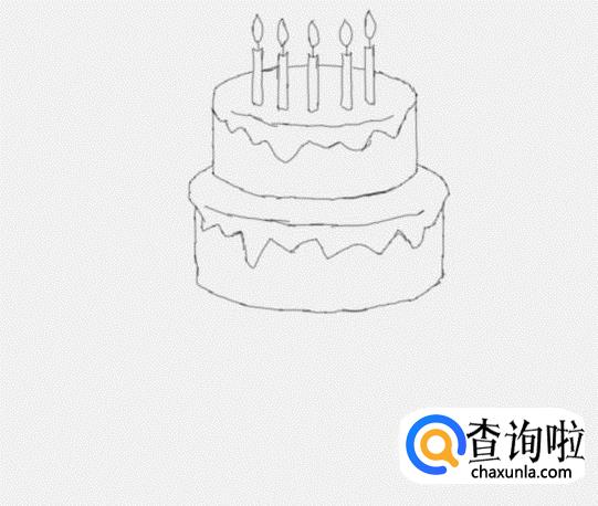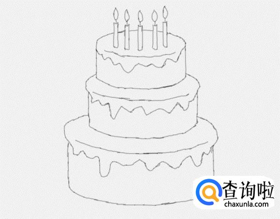 最后在这层蛋糕的下面画出第三层蛋糕,然后在这层蛋糕上画出蛋糕油在,这样我们的三层蛋糕就画好了如图所示: