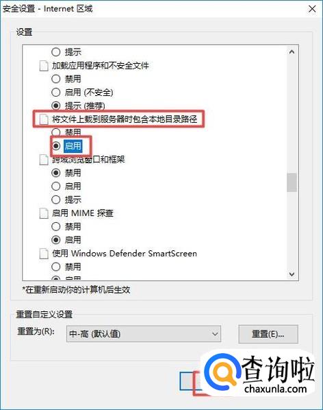 然后我们点击将文件上载到服务器时包含本地目录路径中的启用,之后我们点击确定,然后我们需要重启浏览器,之中这个问题也就解决了。