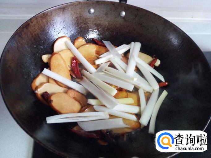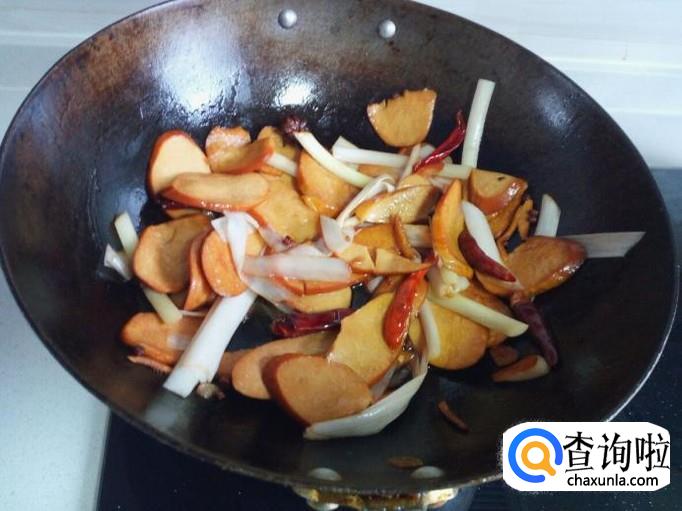 炒素鸡的时候,适当放些水,炒至素鸡变软,放入葱段。