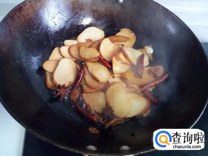 锅内放入比平时炒菜多一些的油,加热,油热后放入八角,花椒,红干椒爆锅,放入姜,蒜,炒香。