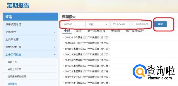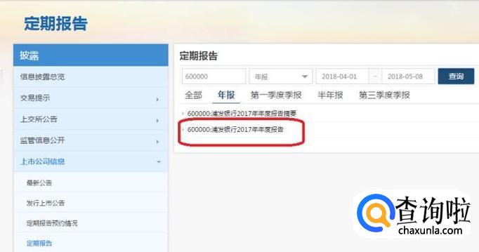 我们只需要输入想查询的上市公司代码、类别选“年报”,然后选择日期就行了,我们以600000为例,查询2017年年报并下载它。输入代码及大致信息(年报一般都在第二年的四、五月公布),点击“查询”。
