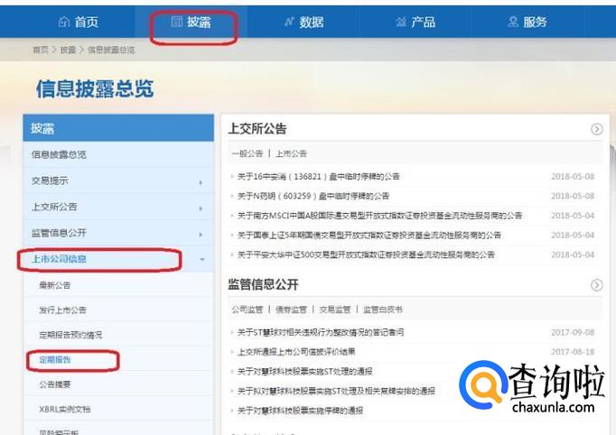 点击上部“披露”按钮,选择“上市公司信息”,然后点击“定期报告”。