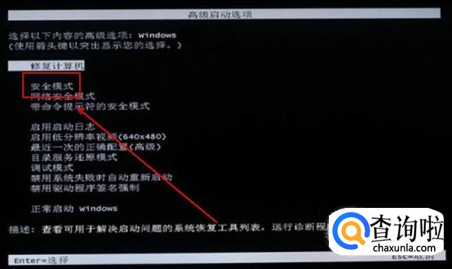 开机时按F8进入“高级启动选项”并选中安全模式。