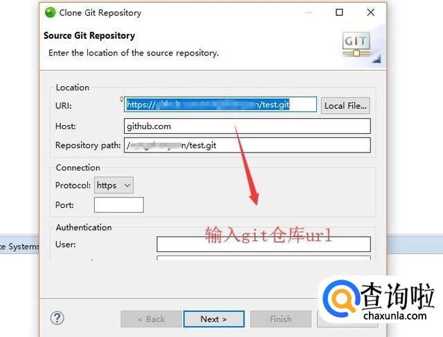 接下来在弹出的Clone Git Repositories界面输入Git仓库的地址,如下图所示