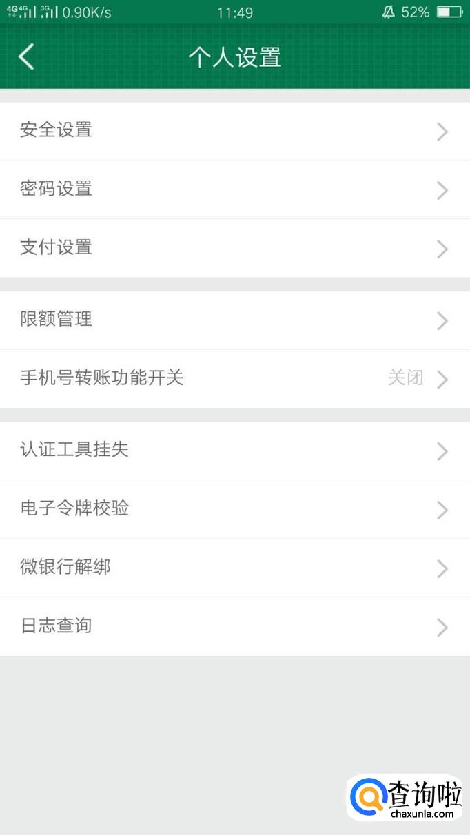账户登录成功之后,再点击“我的”就会出现下图一的界面,点击“个人设置”就可以对各种手机银行设置进行操作,可以更改支付密码、登录密码以及其他一些设置。