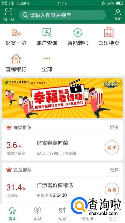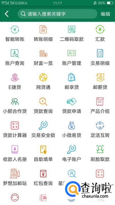 在手机银行的首页,我们可以看到一些功能,点击全部,就可以查看到邮政银行的手机银行包括的所有功能了,转账和用户查询应该是我们用得最多的功能,其他就是一些关于贷款的功能了。(具体可以点进去了解)