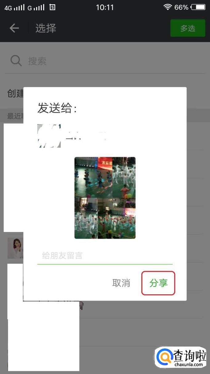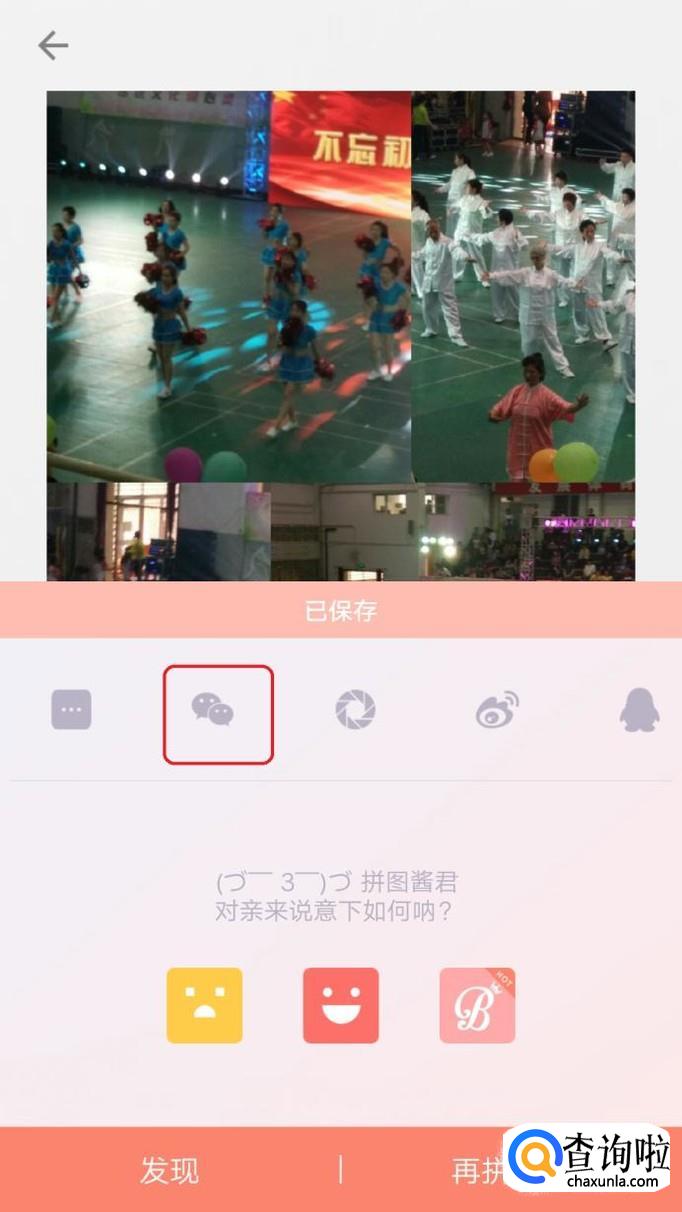 此时弹出如下“已保存”界面,我们点击微信图标就可以发送给别人了,选择接收人之后,点击“分享”,拼图就发送完成了。