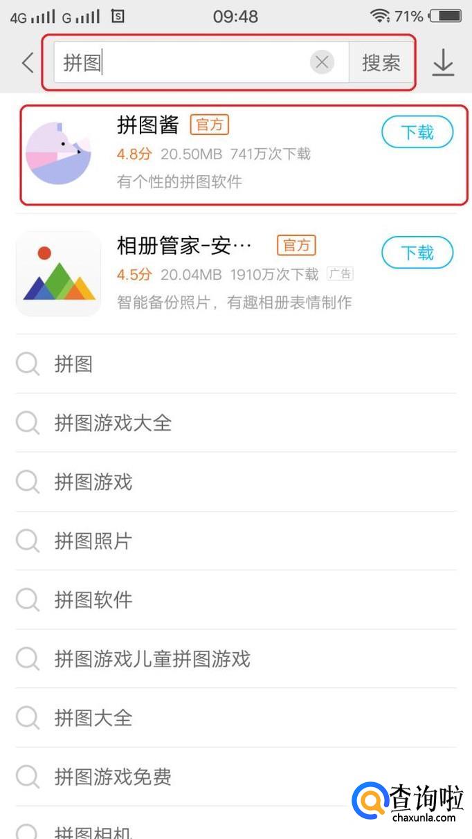 首先,打开系统自带的应用商店,搜索下载拼图软件app,在搜索结果中选一个下载安装,比如我本次演示安装“拼图酱”app。