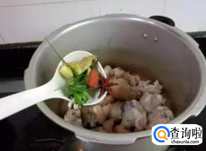 然后把猪蹄放入高压锅,加姜片,葱结,八角,桂皮等。(可依据自己口味适当增加佐料)
