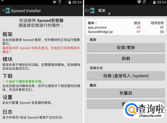 点击左上角三短横线菜单,选择”模块“,对已经安装好的模块打勾,然后重启手机。