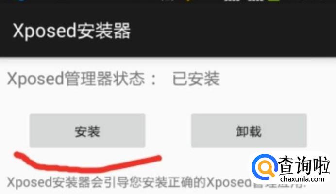 打开xposed installer,如下图所示,选择箭头位置,点击后出现菜单,选择“安装”或“Install”按钮,根据提示下载安装,然后等待手机重启;