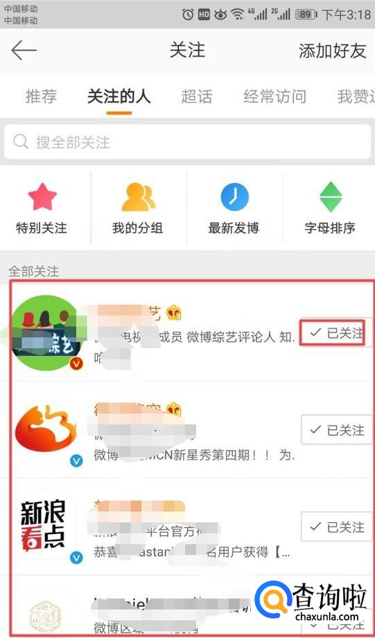 弹出的界面,我们就可以看到我们关注的人了,我们点击已关注;