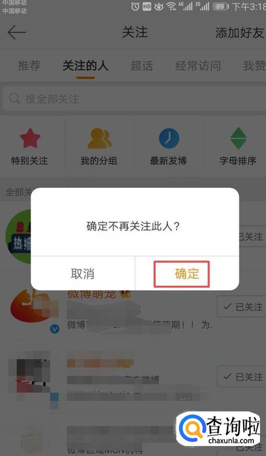 弹出的界面,我们看到显示的是确定不再关注此人,我们点击确定就取消关注了。