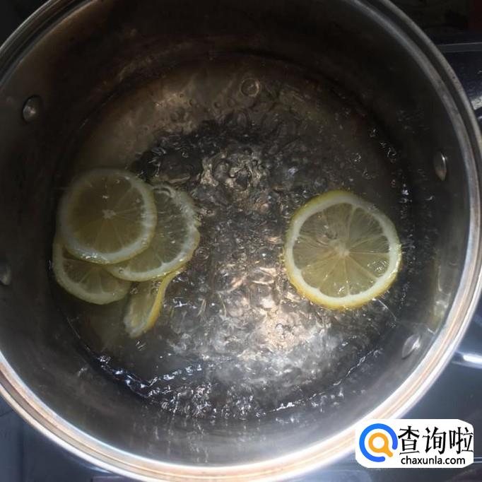 接着往锅中放入适量的清水,待水烧开倒入柠檬片煮五分钟,如下图所示。