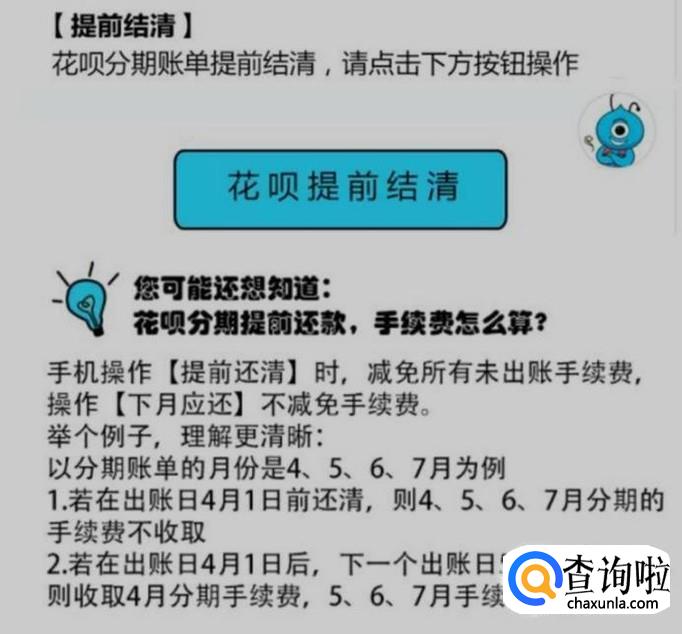 举个例子,你要还2、3、4月的花呗分期,你在1月还清了这三月的花呗,就不给手续费,但是如果你在2月还清所有,就要不收3、4月的的手续费。