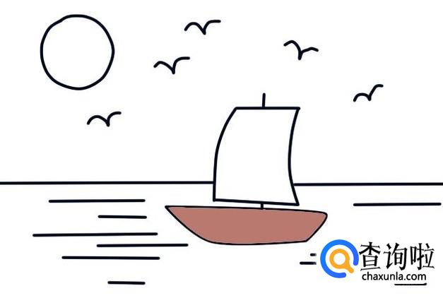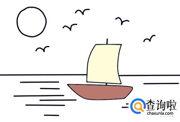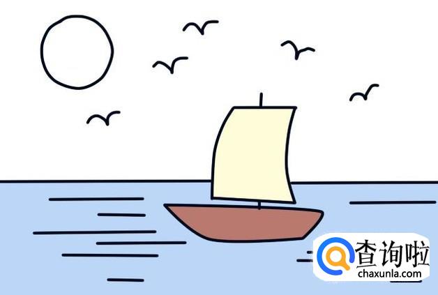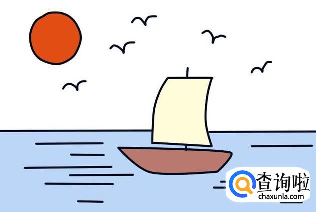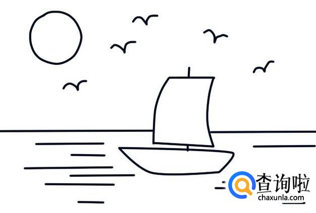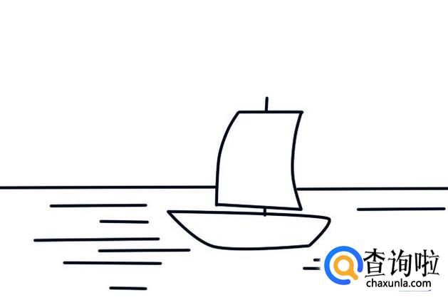 在船帆的两侧,画一条水平的直线,表示海平面。在海平面下方,画一些长短不一的直线,表示海上的波纹。